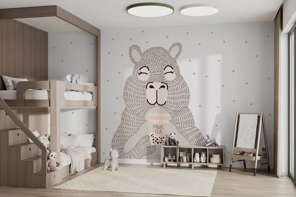 Fotomurales Bonito carpincho beige grande con camiseta de burbujas en estilo minimalista sobre fondo blanco punteado Nr. w01122