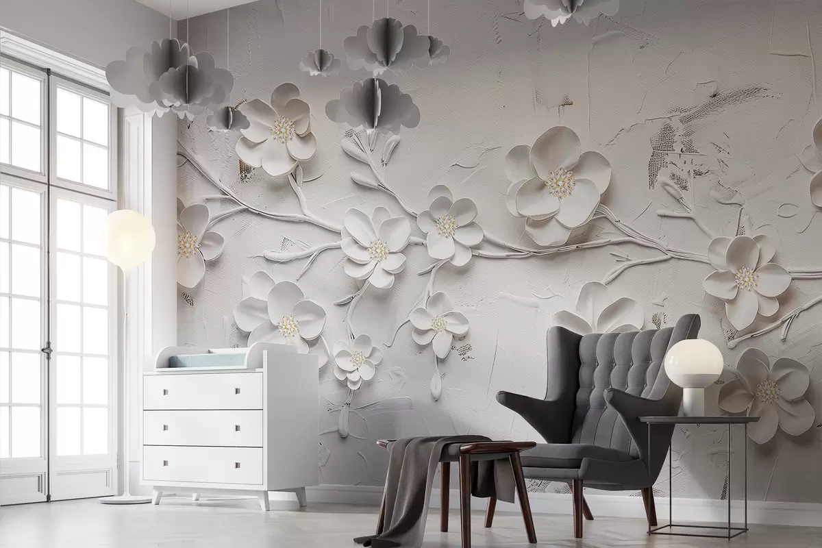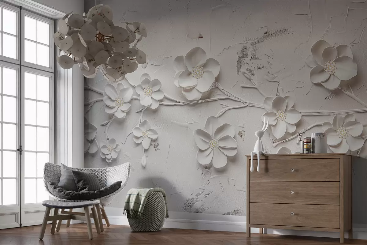 Fotomurales Fondo blanco texturizado con flores blancas 3D en plena floración, conectadas por ramas, minimalistas y elegantes Nr. w01226