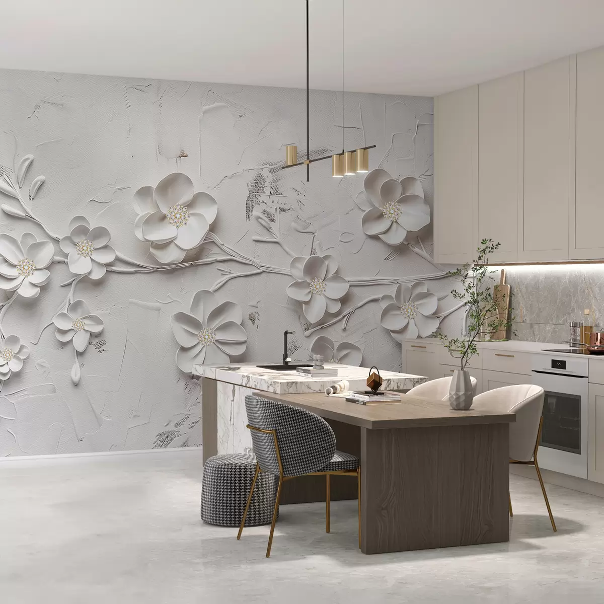 Fotomurales Fondo blanco texturizado con flores blancas 3D en plena floración, conectadas por ramas, minimalistas y elegantes Nr. w01226
