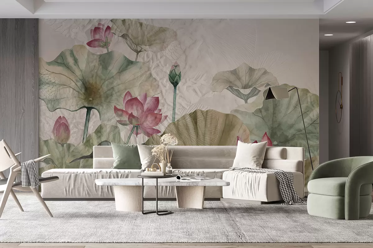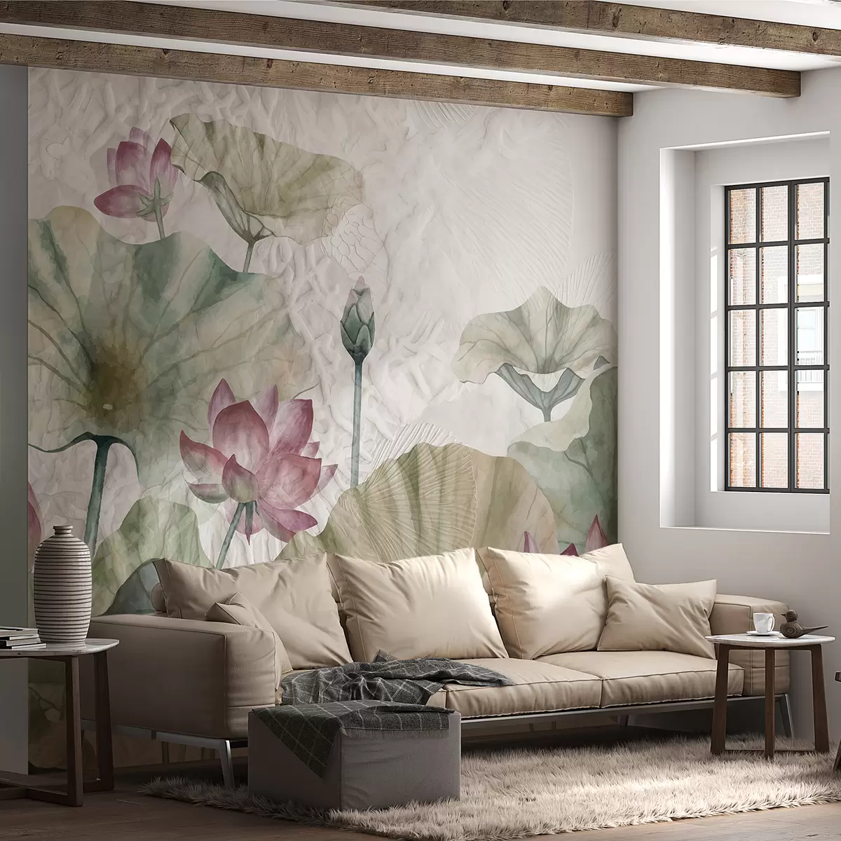 Fotomurales Flores de loto rosa con hojas verdes sobre un fondo de textura clara Nr. w01248