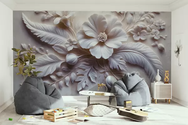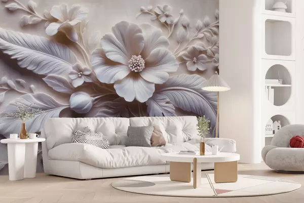 Fotomurales Arte de pared en relieve 3D con plumas y flores, con una gran amapola en colores rosa claro Nr. w01340v1
