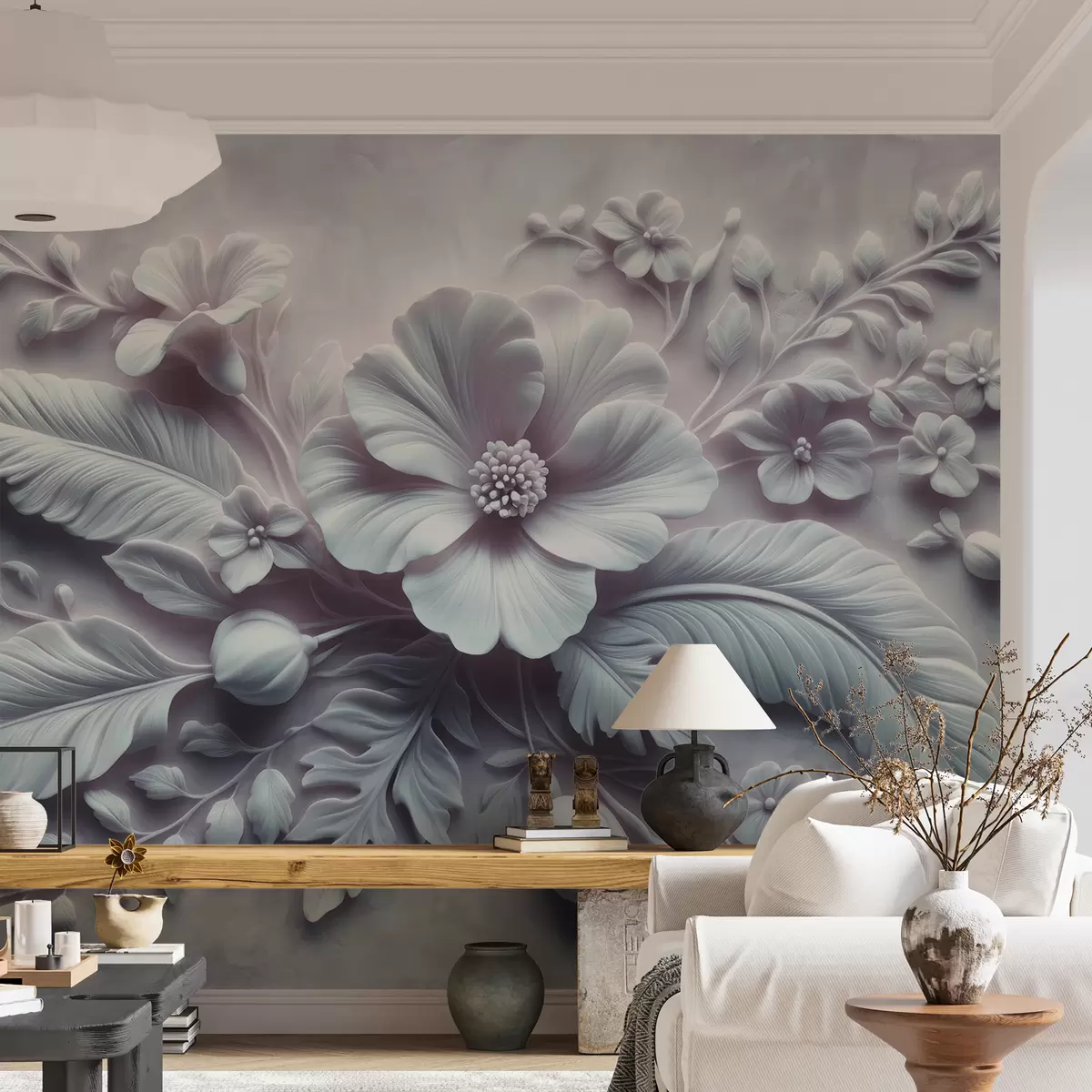 Fotomurales Arte de pared en relieve 3D con plumas y flores, con una gran amapola en colores azul claro Nr. w01340v2