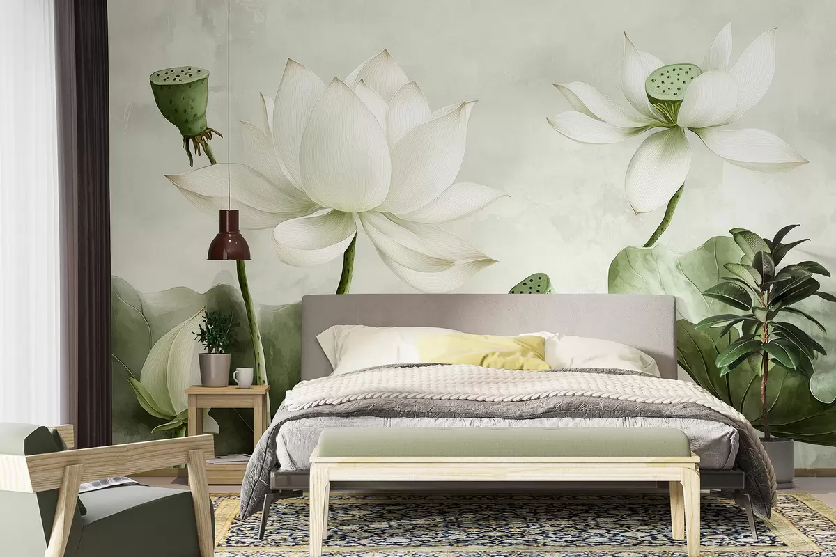 Fotomurales Flores de loto, acuarela, naturaleza, composición floral, hojas grandes, colores verdes suaves. Nr. w01445v2