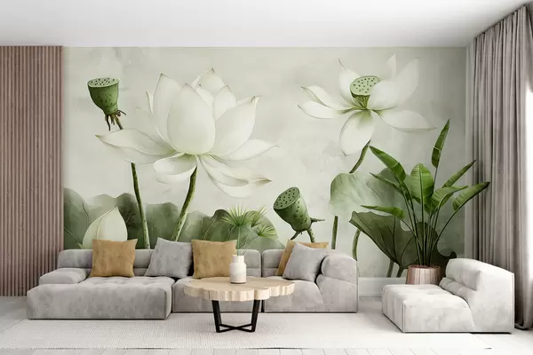 murales de pared Flores de loto, acuarela, naturaleza, composición floral, hojas grandes, colores verdes suaves. w01445v2