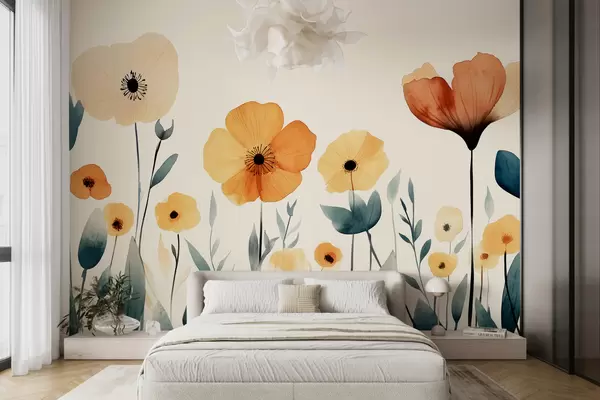 Fotomurales Acuarela de flores de prado, rústica, composición floral, dibujo sencillo, beige, naranja, azul Nr. w01453