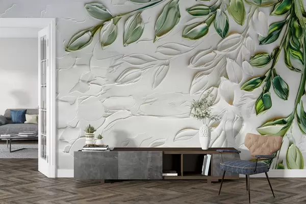 Fotomurales Pintura al óleo 3D con rama verde sobre fondo blanco, diseño minimalista en estilo boho Nr. w01470