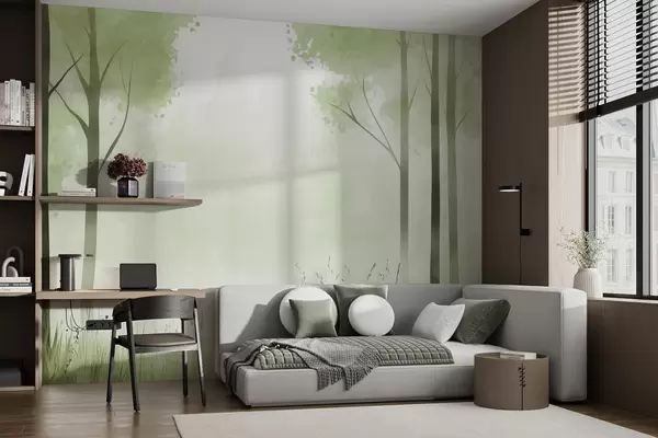 Fotomurales Acuarela bosque, niebla, árboles, hierba, paisaje natural, color verde Nr. w01563v2