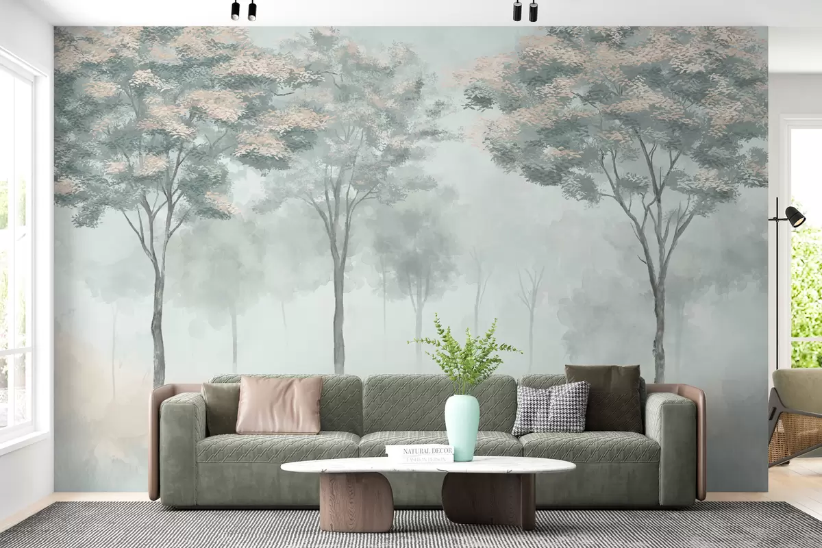 Fotomurales Silueta de bosque brumoso en colores verde, gris claro y beige Nr. w01599