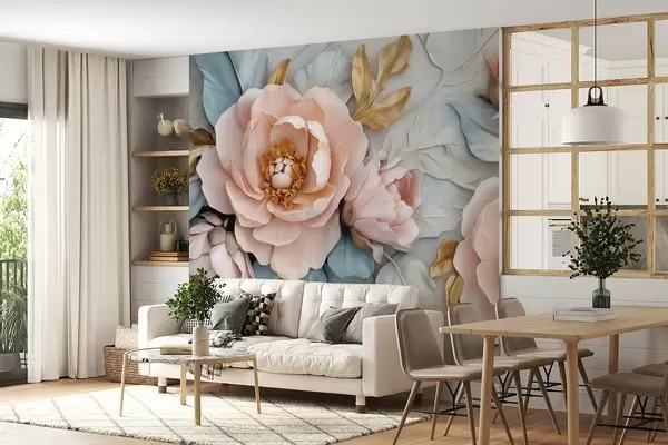 Fotomurales Lujosos pétalos y peonías rosas en tonos azul y rosa pastel Nr. w01826