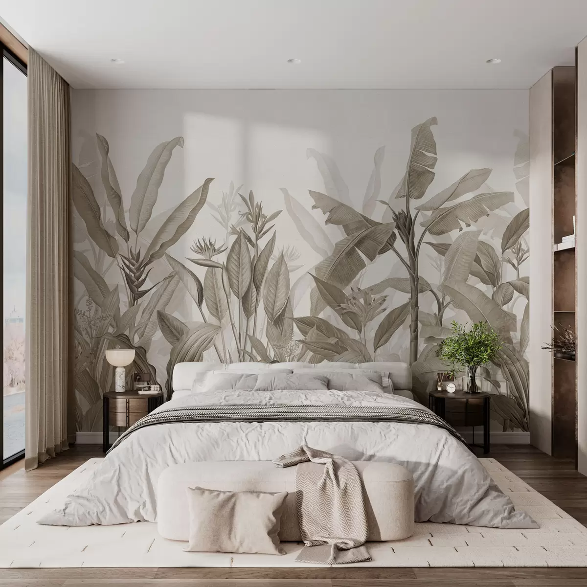 Fotomurales Hojas y flores tropicales sobre fondo claro en estilo sepia Nr. w01834v4