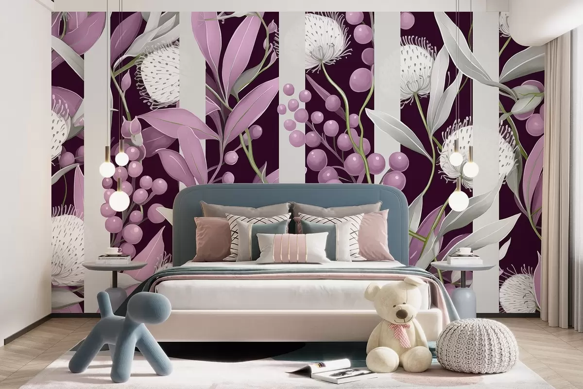 Fotomurales Adorno de flores con bayas silvestres, vintage, colores rosa y verde Nr. w01886v1