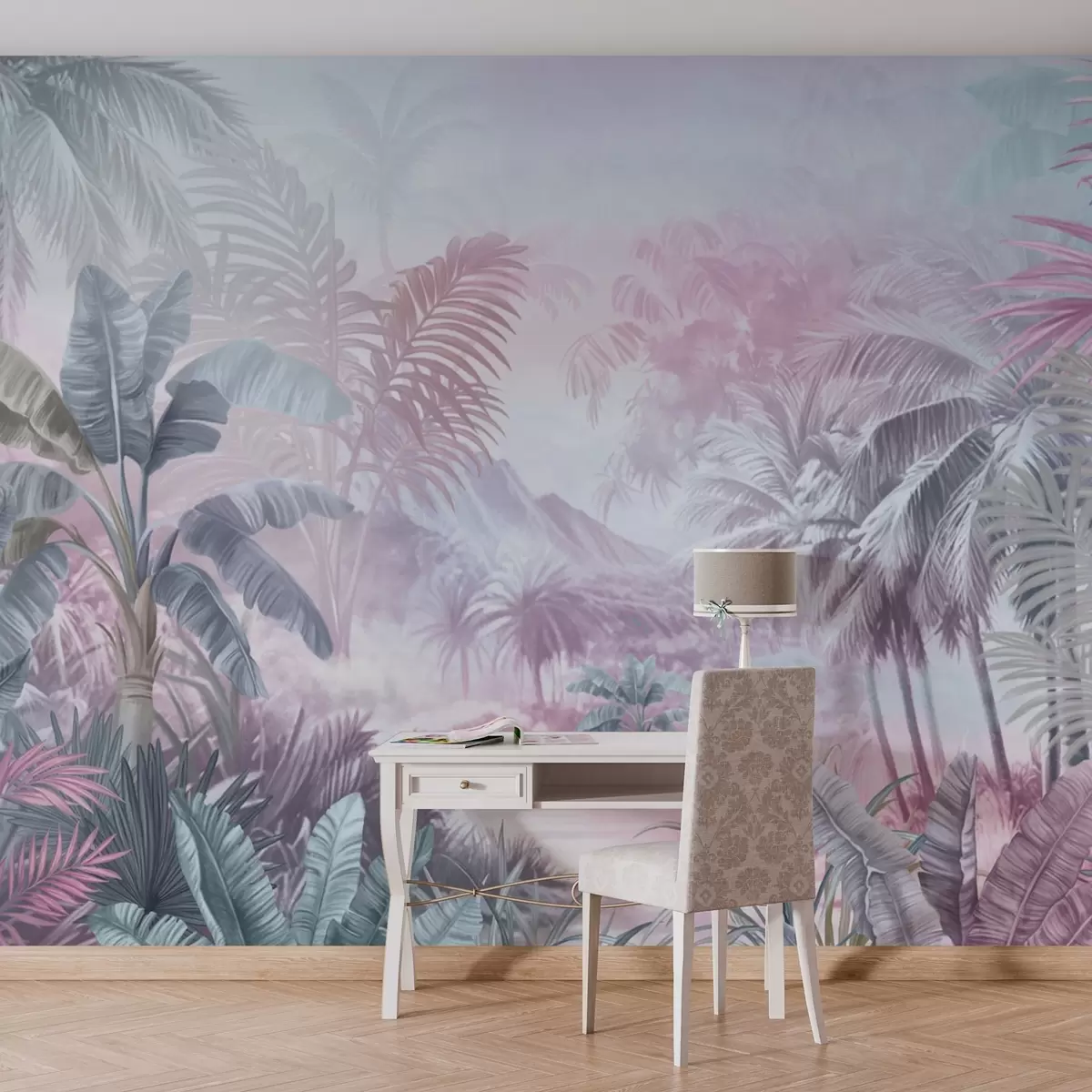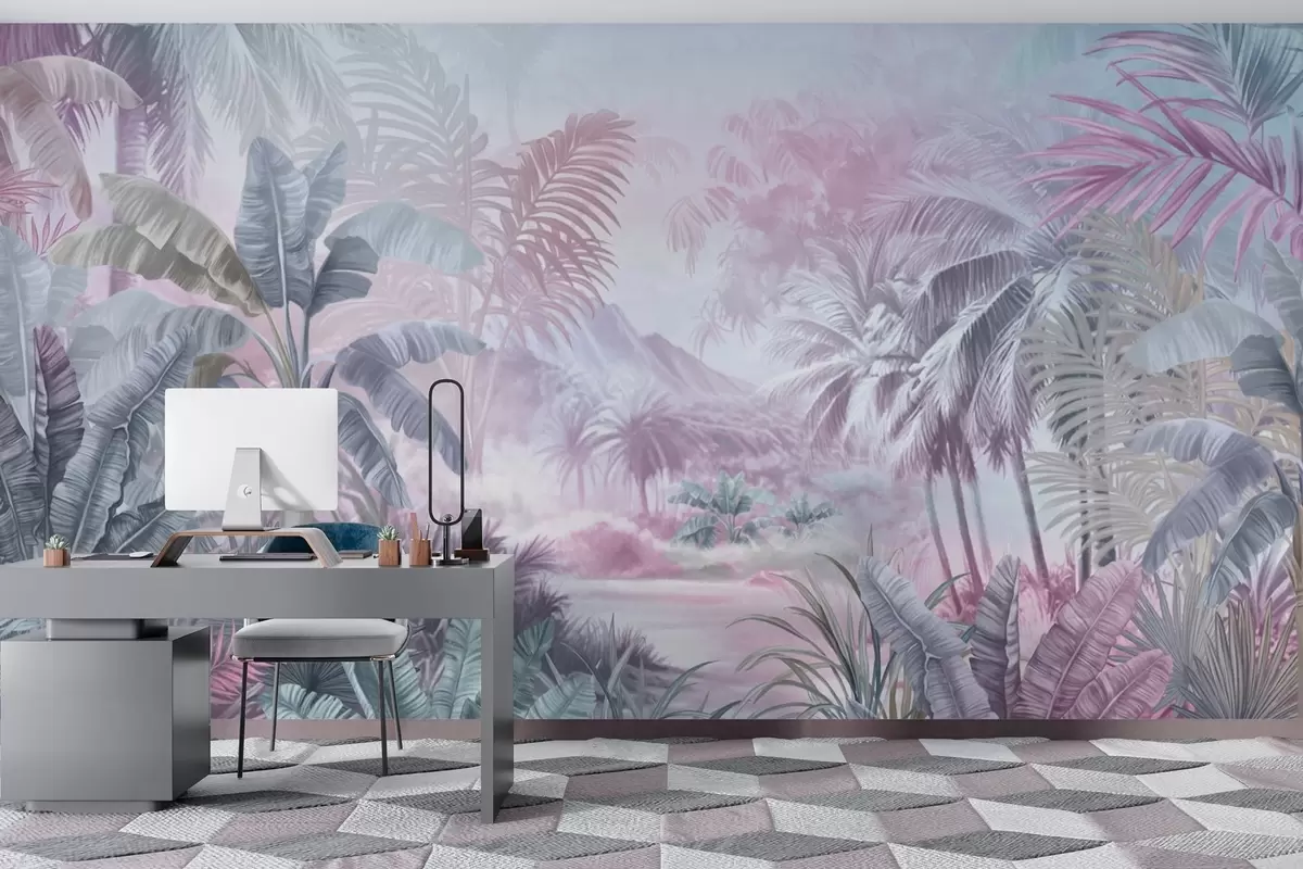 Fotomurales Selva tropical en suaves tonos azules y rosas Nr. w01931v2