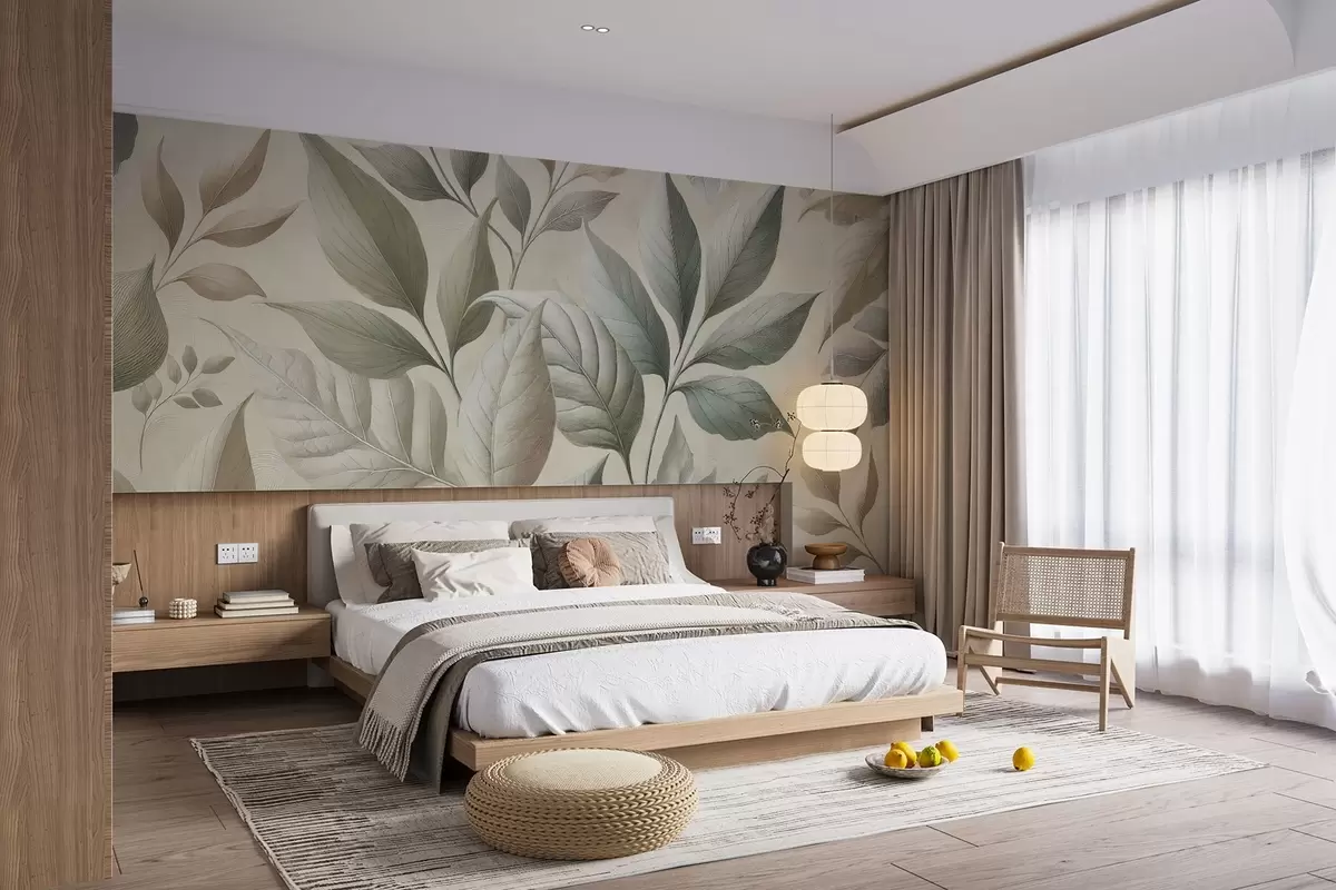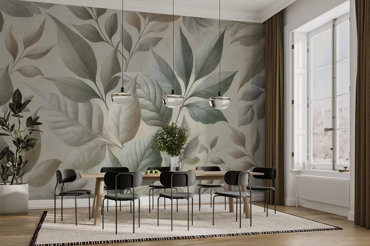 Fotomurales Exquisito estampado de grandes hojas en elegantes tonos crema y beige Nr. w01959