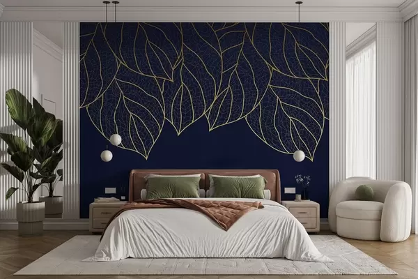 Fotomurales Papel pintado minimalista siluetas de grandes hojas amarillas veteadas sobre fondo azul Nr. w01960v3