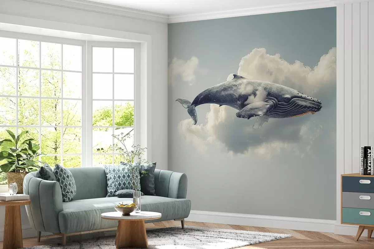 Fotomurales Gran ballena de fantasía nadando entre las nubes sobre un fondo de cielo azul claro Nr. w01962