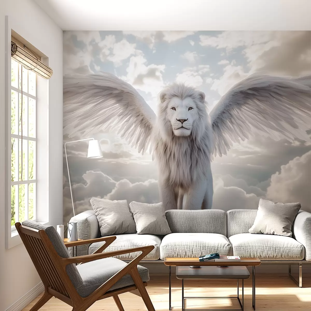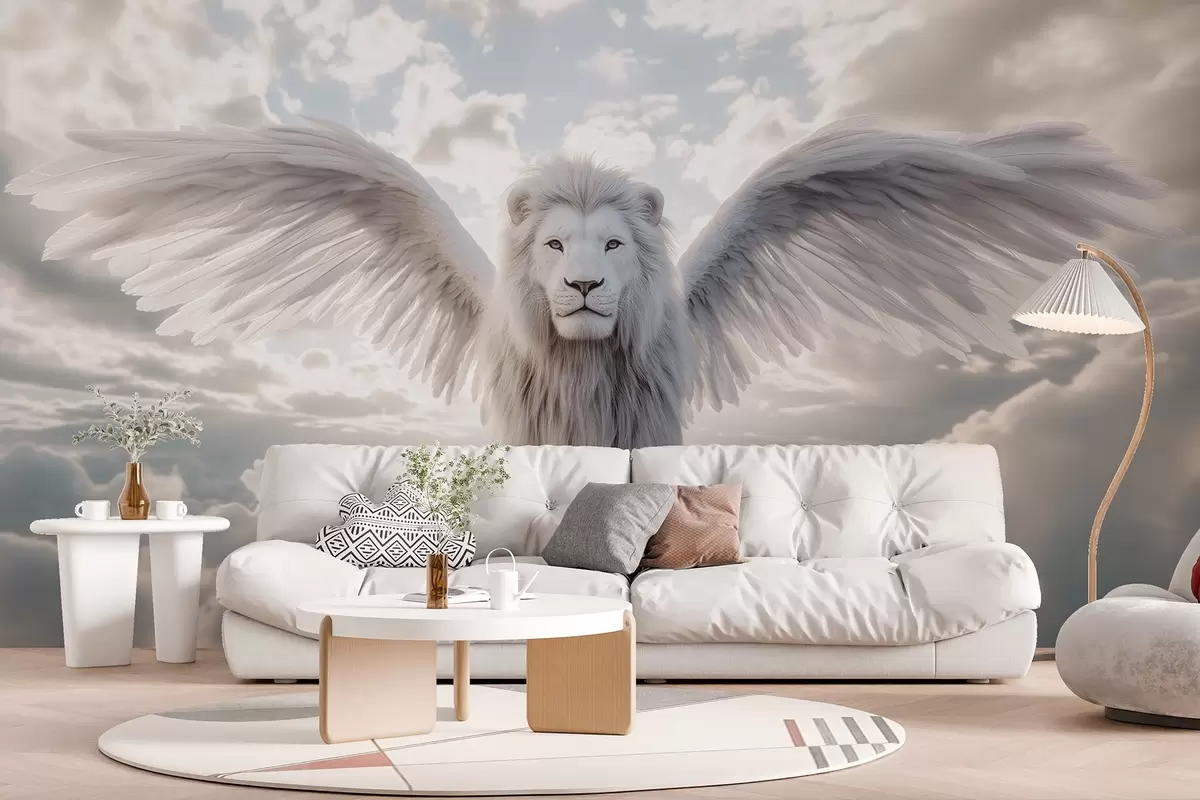 Fotomurales Majestuoso león blanco con una hermosa y exuberante melena blanca y alas contra el cielo en colores grises Nr. w02144v1