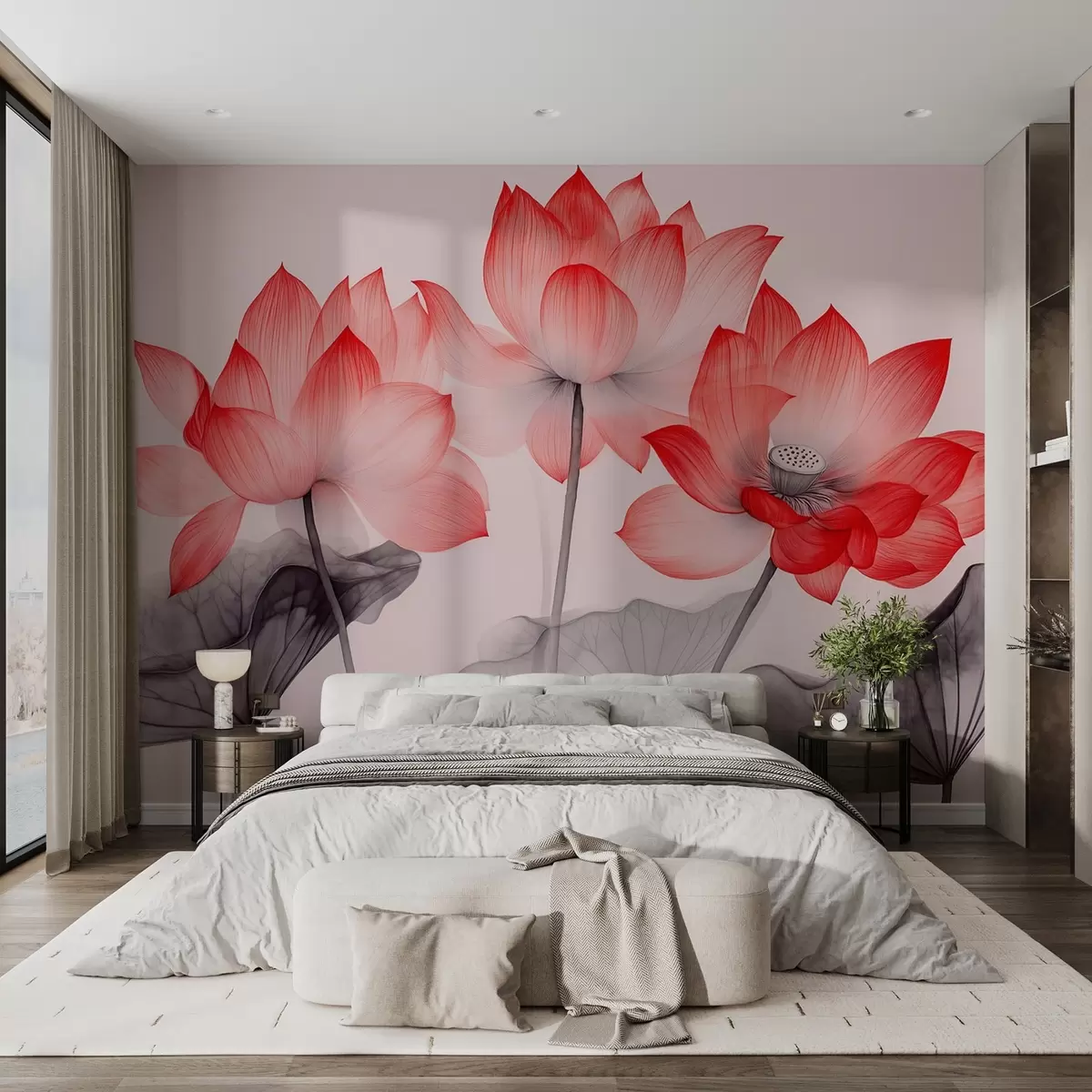 murales de pared Tres flores de loto rojas en estilo de pintura china w02146