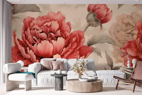 Fotomurales Peonías rojas y beige con hojas verdes Nr. w02160
