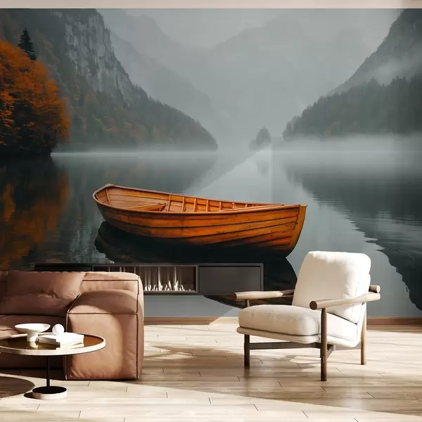Fotomurales Un barco de madera flota en un lago, rodeado de espesa niebla y montañas detrás Nr. w02195