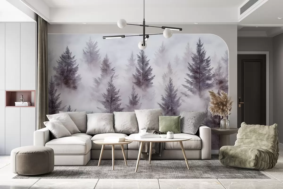 murales de pared Hermoso bosque con pinos, niebla, paisajes de naturaleza, colores púrpura w02222v1