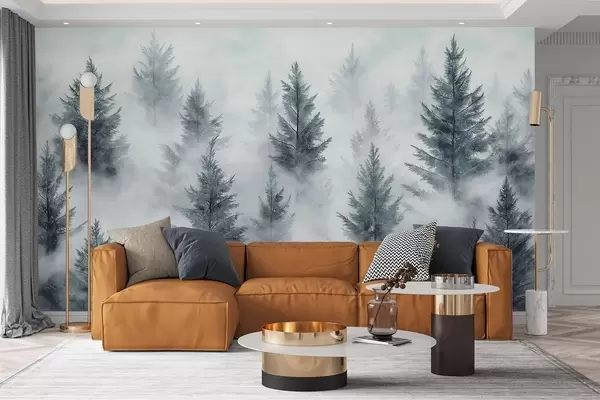 Fotomurales Hermoso bosque con pinos, niebla, paisajes de naturaleza, colores grises Nr. w02222v2