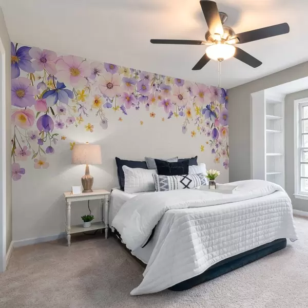 murales de pared Delicado arreglo floral con flores de acuarela en suaves tonos pastel de rosa, morado y amarillo. Las flores caen suavemente en cascada desde arriba, dejando un ligero fondo estampado debajo. w02345