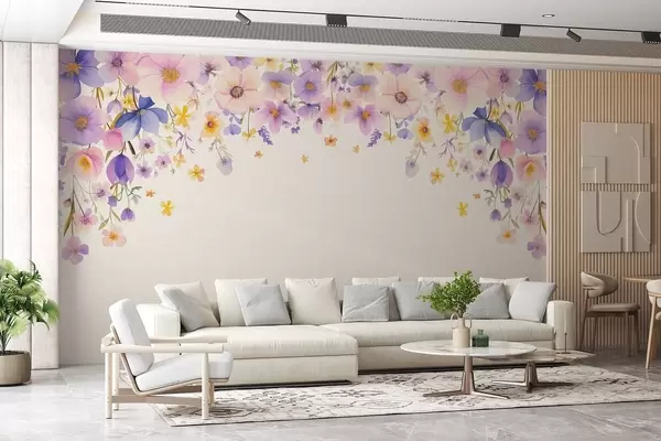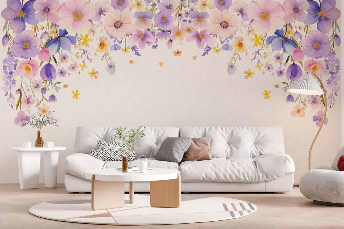 Fotomurales Delicado arreglo floral con flores de acuarela en suaves tonos pastel de rosa, morado y amarillo. Las flores caen suavemente en cascada desde arriba, dejando un ligero fondo estampado debajo. Nr. w02345