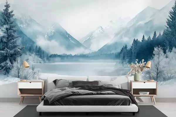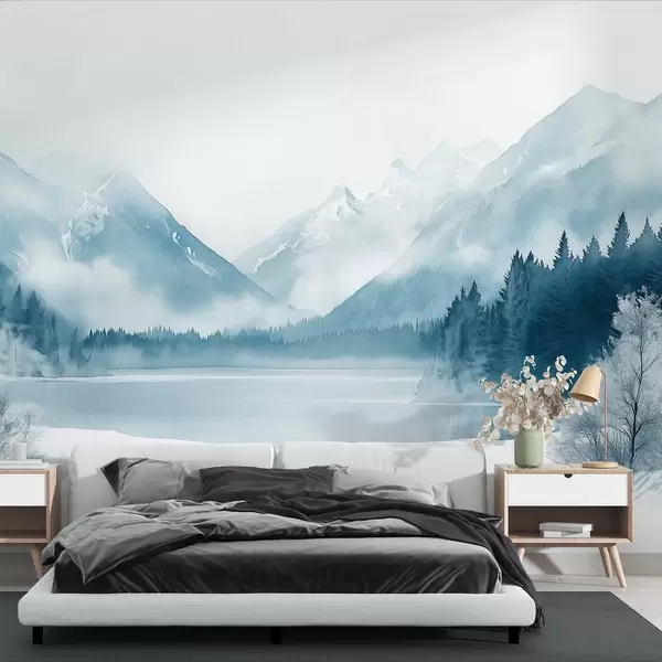 Fotomurales Montañas invernales, lago helado, bosque de pinos, paleta de colores azules, estilo acuarela Nr. w02354