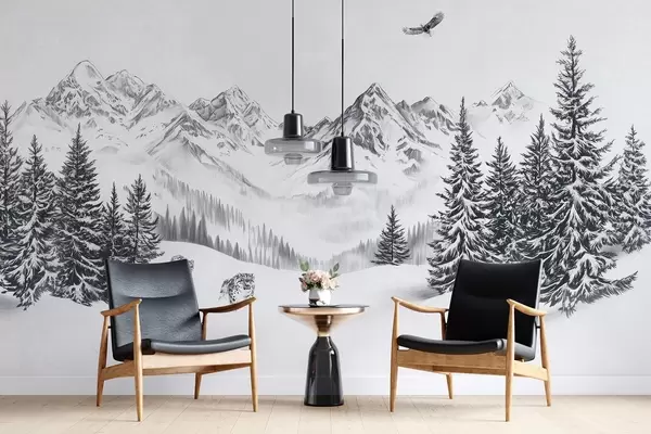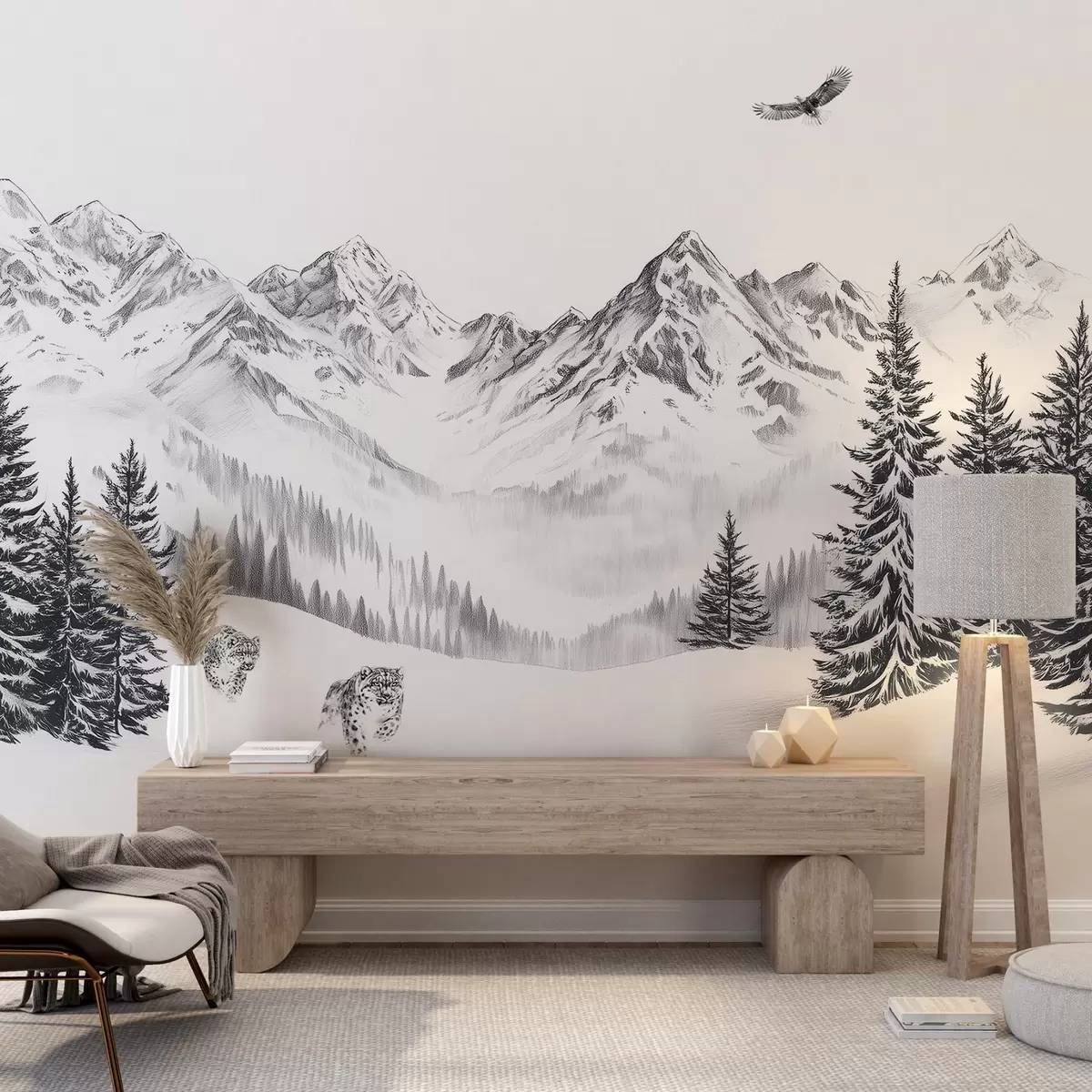 Fotomurales Montañas invernales, leopardos de las nieves, bosque de pinos, dibujo a lápiz, águila volando Nr. w02360