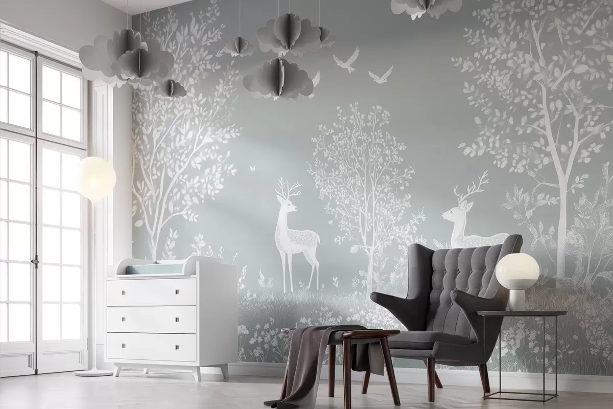 Fotomurales bosque con ciervos en el estilo de un dibujo de tiza sobre un fondo gris Nr. w02444v2