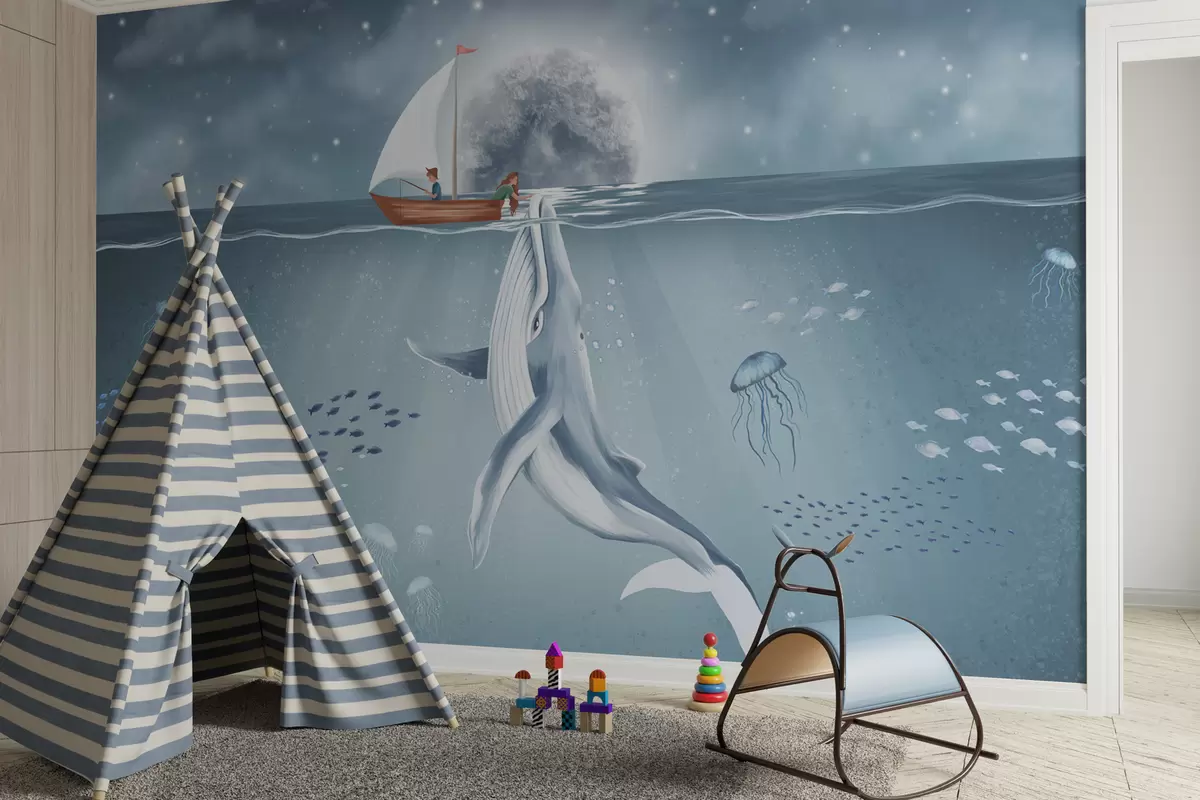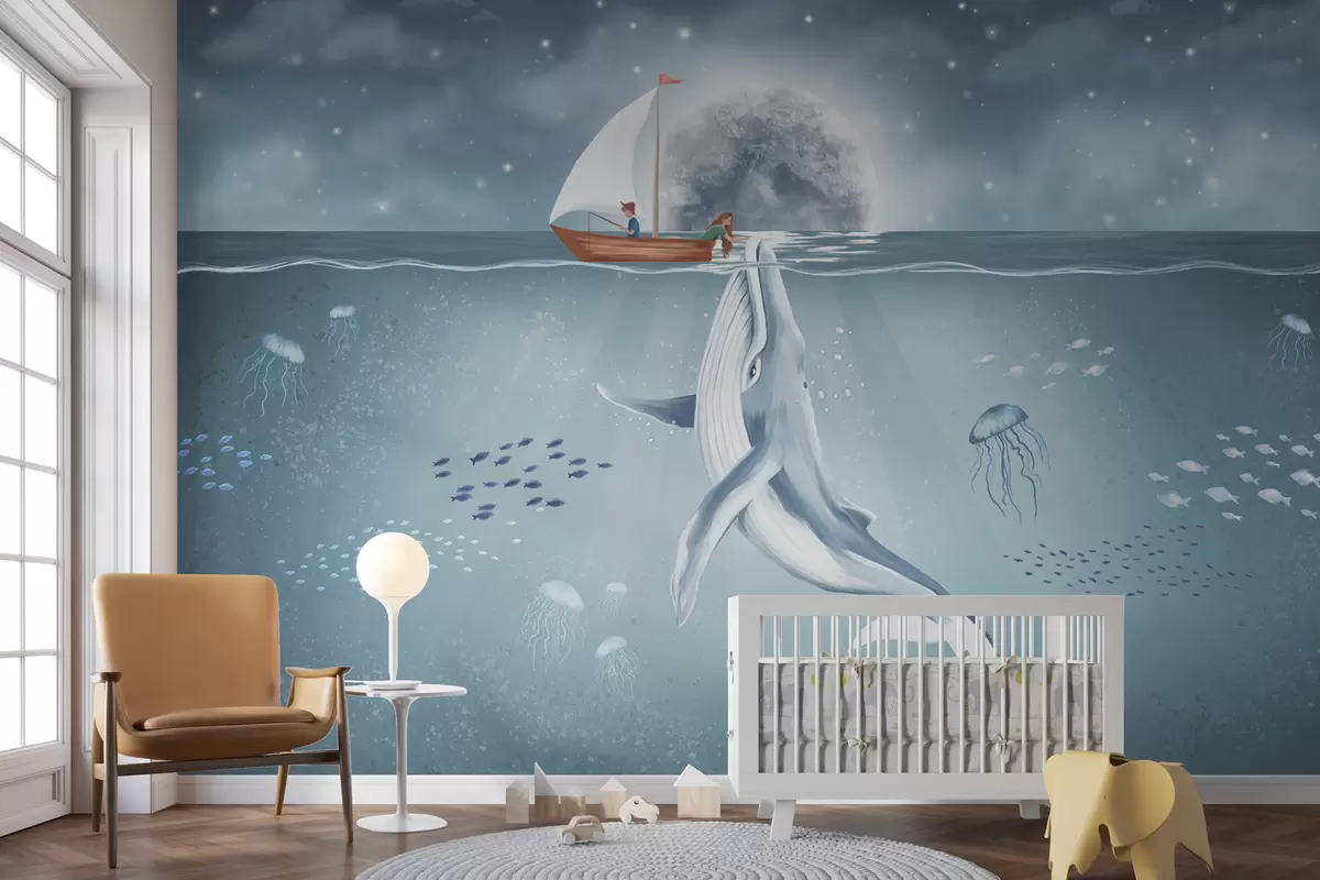 Fotomurales Diseño infantil con ballena, luna y barco con niños Nr. w02476