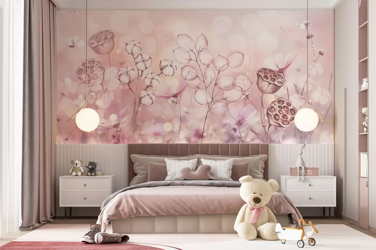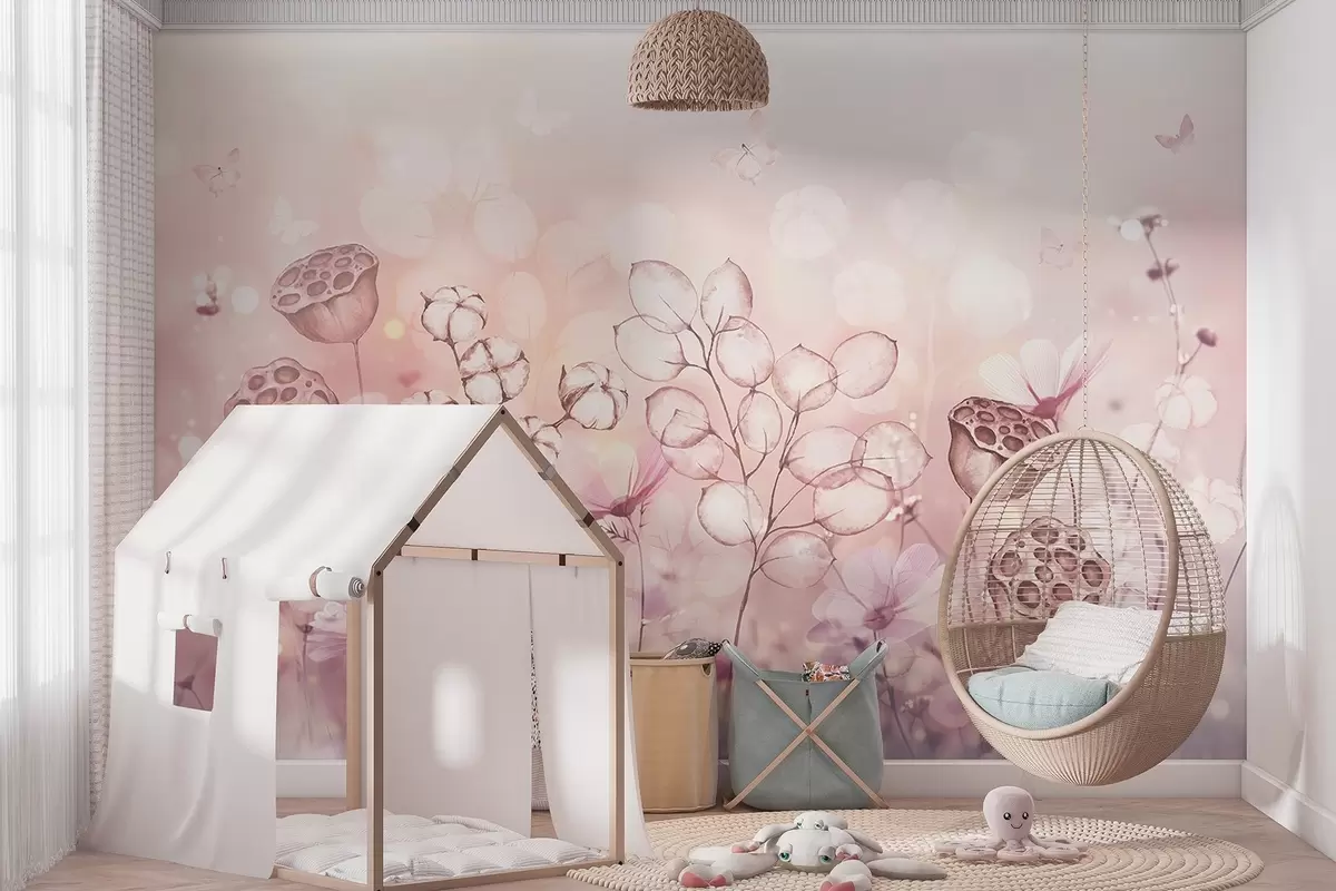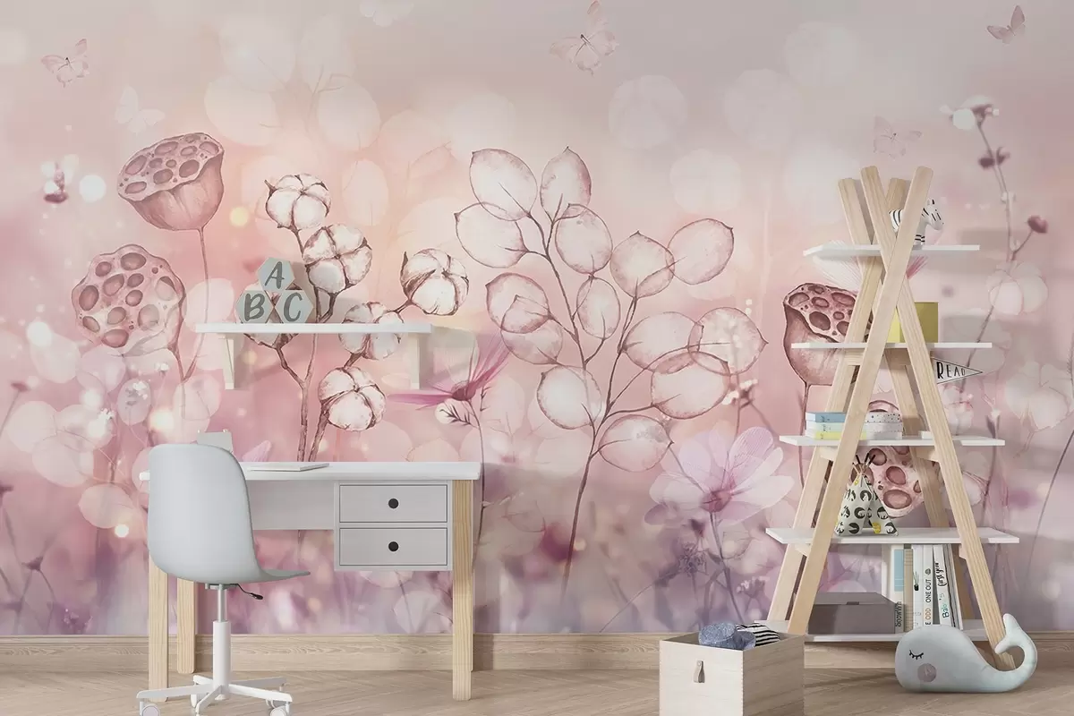 Fotomurales Jardín de flores de ensueño, mariposa, flores de algodón, lotos, colores rosas Nr. w02516