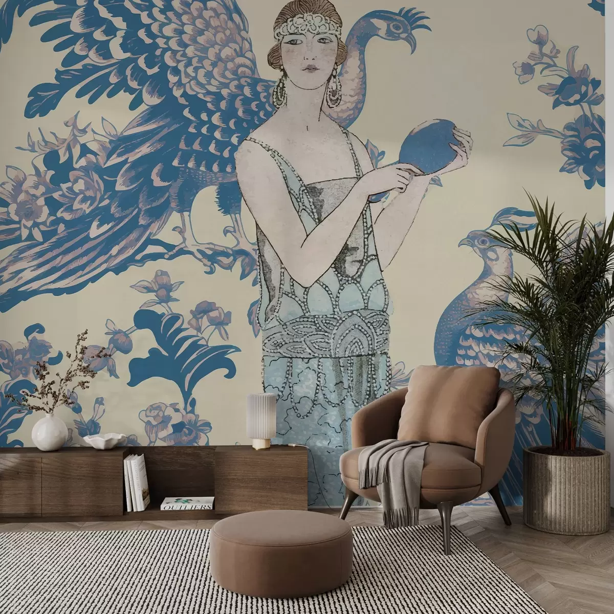 Fotomurales Elegante motivo floral vintage con una mujer en tonos azules y rosas Nr. w02532