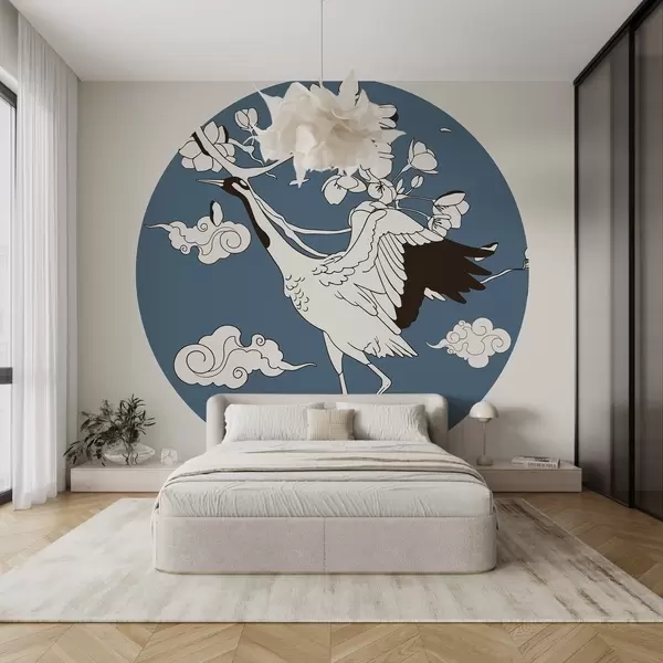 Fotomurales Dibujo en círculo, flores, nubes en estilo japonés, grulla, parte azul Nr. w02538