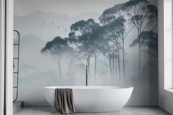 Fotomurales Árboles en la niebla, paisajes de naturaleza, pájaros, sol, colores azules Nr. w02740v1
