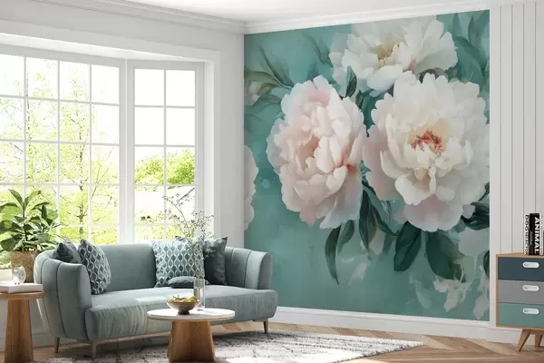 Fotomurales grandes flores de exuberantes peonías sobre fondo turquesa Nr. w02763