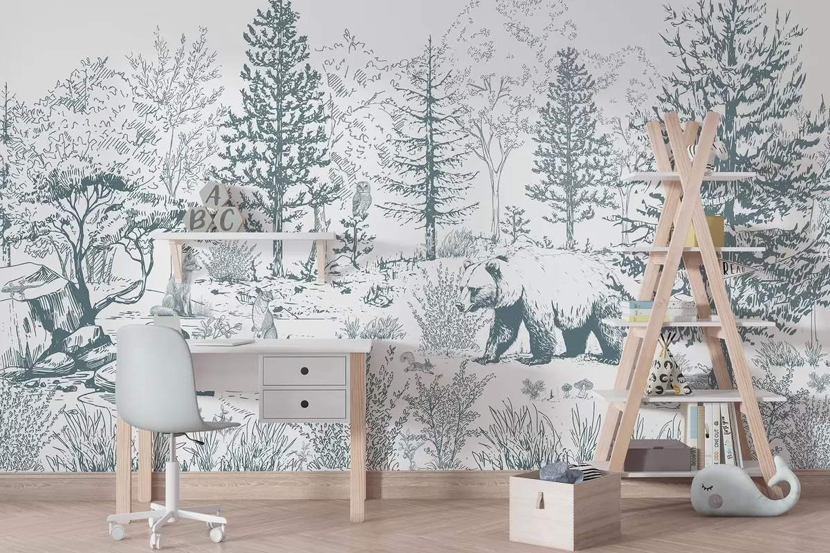 Fotomurales Vida en el bosque, árboles, animales salvajes, oso, zorro, búho, arbustos, dibujo a lápiz, colores azules Nr. w02929v1