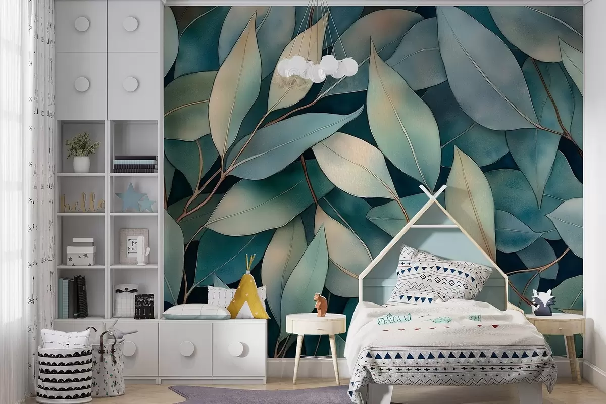 Fotomurales Hojas de eucalipto, dibujo estilo acuarela, motivo floral, colores verdes Nr. w02931