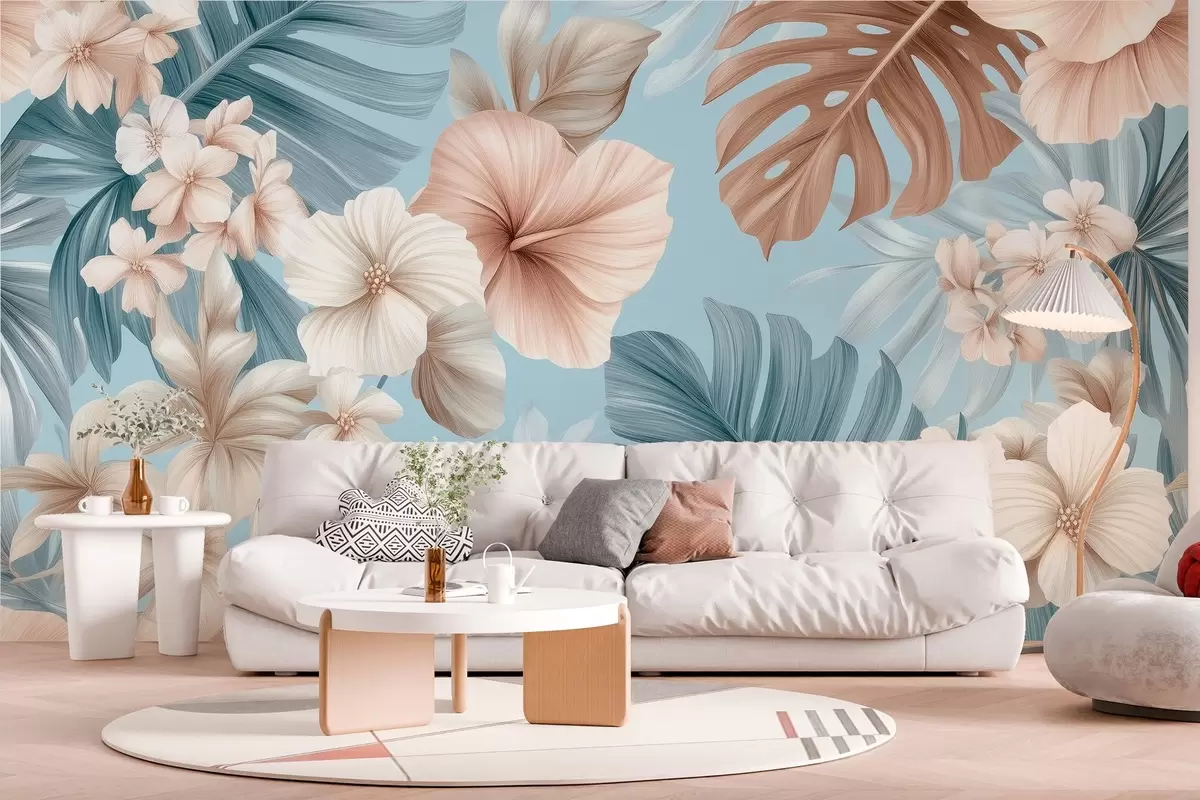 Fotomurales estampado tropical con grandes hojas y flores en tonos azul pastel y beige Nr. w03013