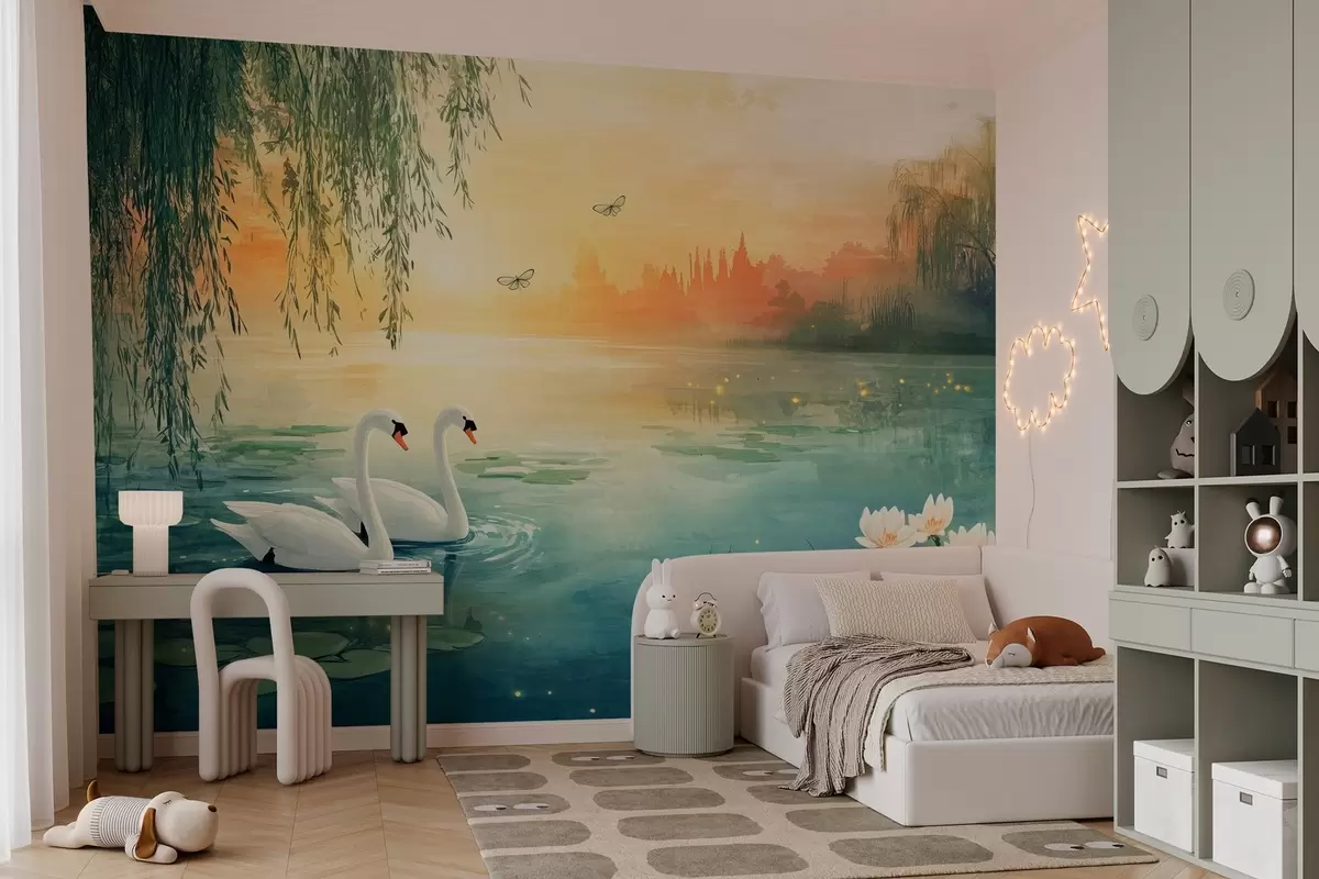 Fotomurales Paisaje romántico al óleo con dos cisnes blancos en el lago Nr. w03017