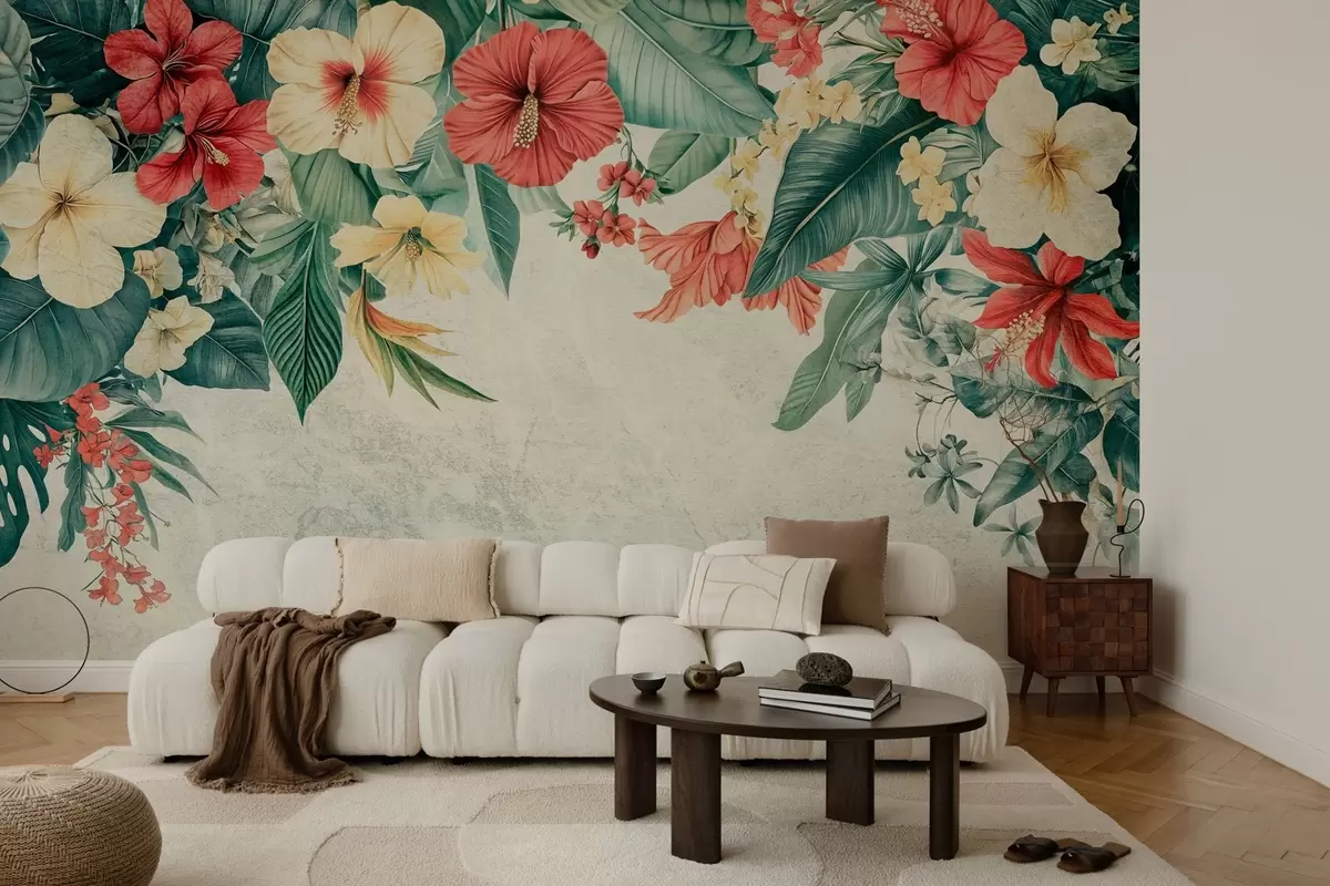 Fotomurales flores y plantas tropicales colgando desde arriba sobre un fondo texturizado Nr. w03023