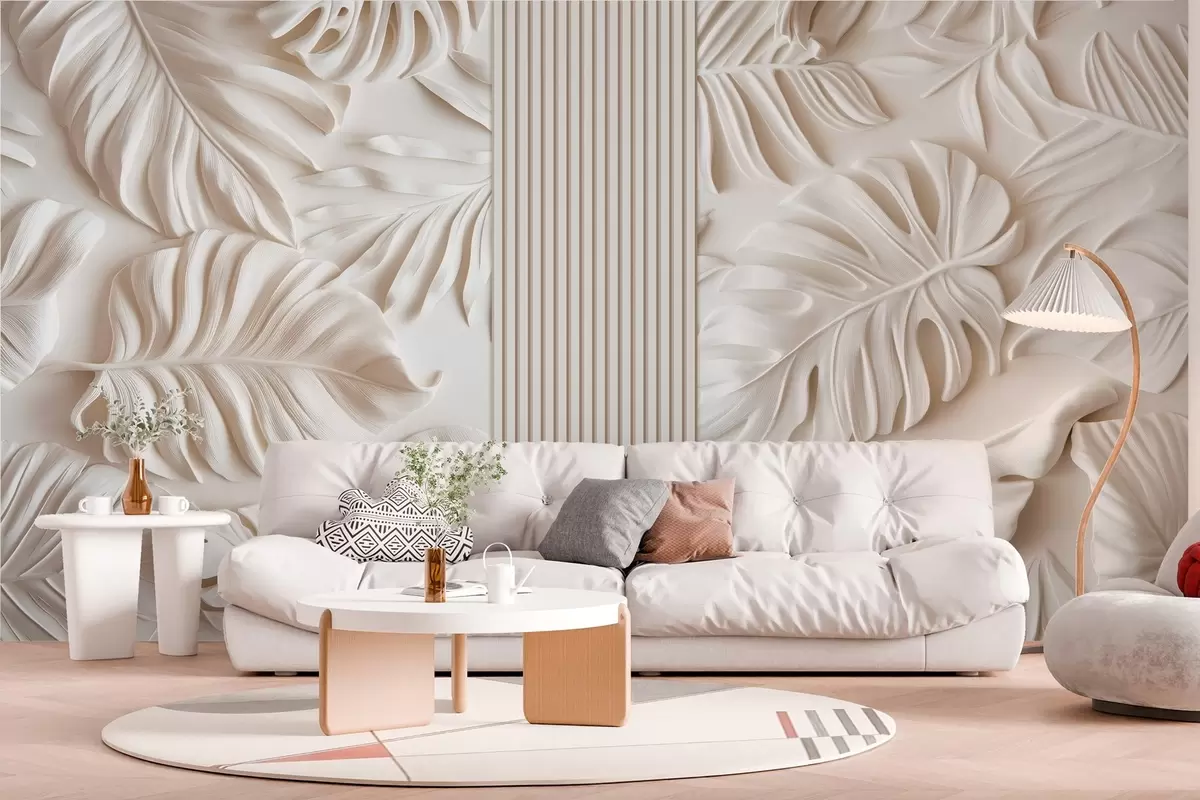 Fotomurales grandes hojas tropicales imitación de bajorrelieve y paneles en colores claros Nr. w03119