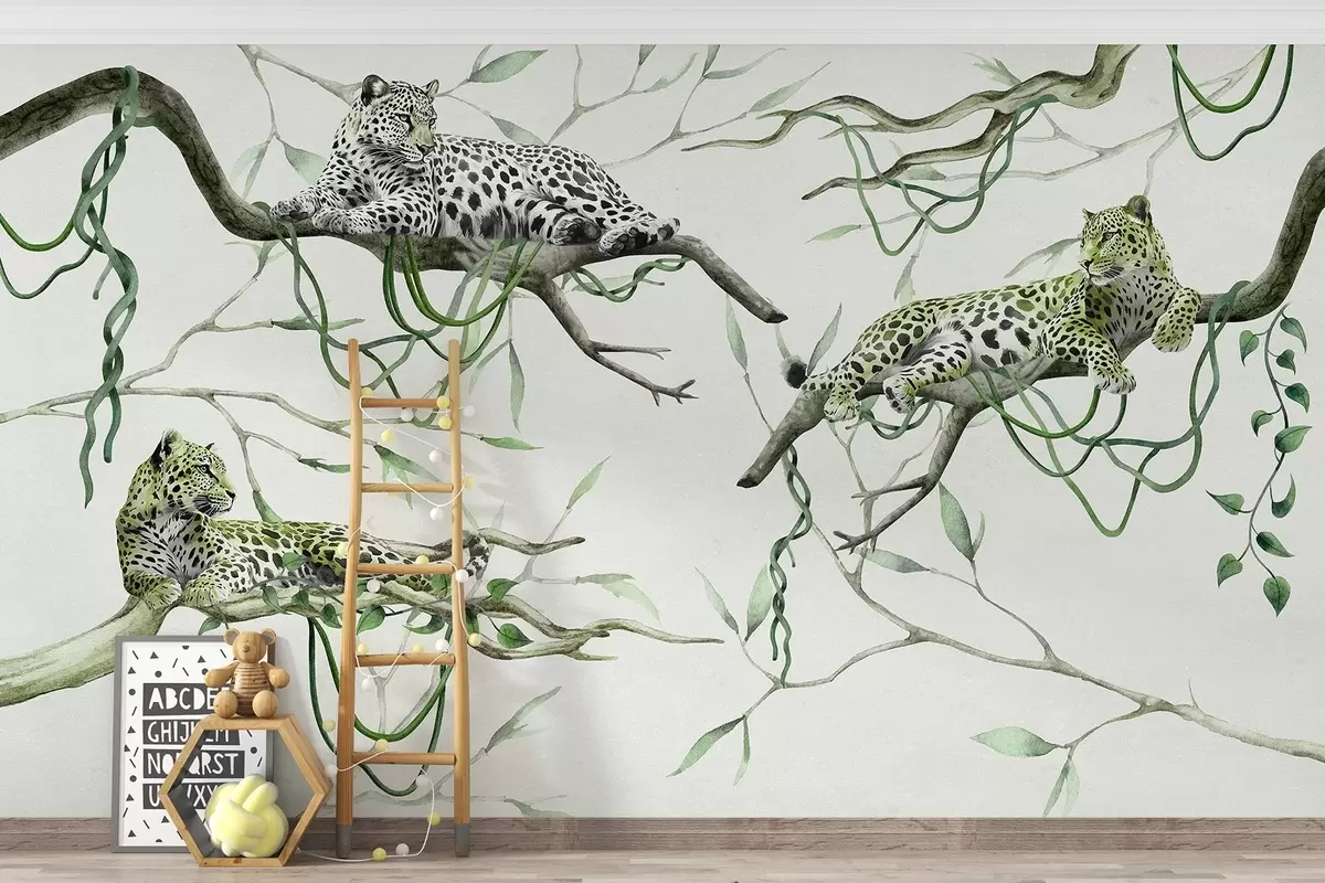 Fotomurales Leopardos en los árboles de la selva, lianas, tropical, animales salvajes, paleta de color verde Nr. w03146v1