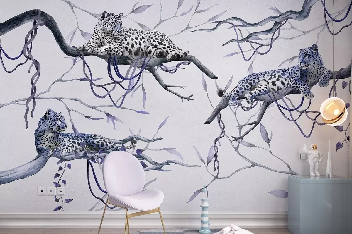 Fotomurales Leopardos en los árboles de la selva, lianas, tropical, animales salvajes, paleta de color púrpura Nr. w03146v3