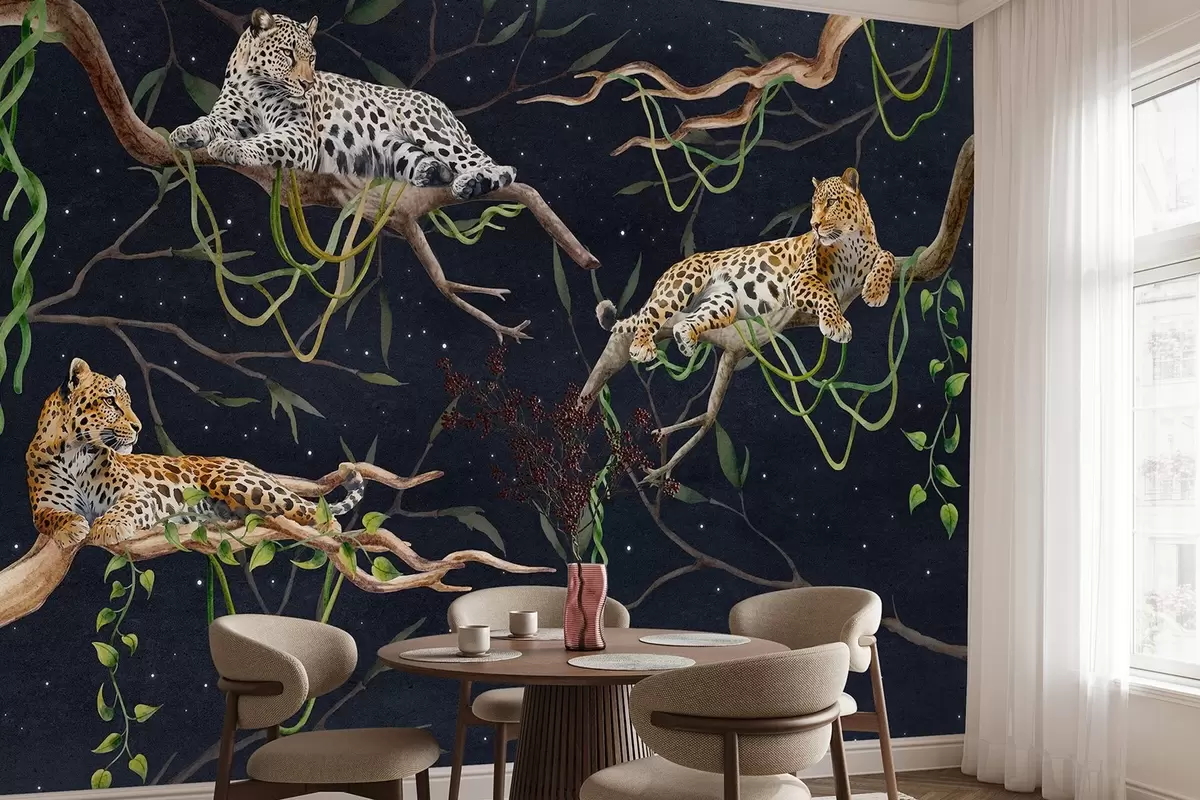 Fotomurales Leopardos en los árboles de la selva, lianas, tropicales, animales salvajes, cielo nocturno con estrellas Nr. w03148