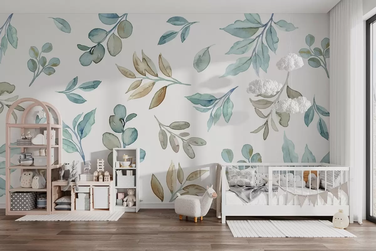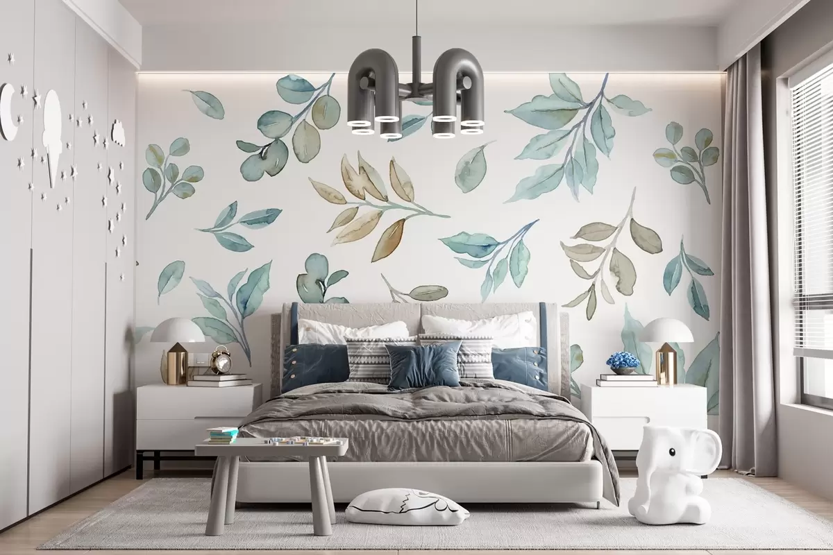 Fotomurales varias hojas y ramas en técnica de acuarela en tonos azules y beige sobre fondo blanco Nr. w03280