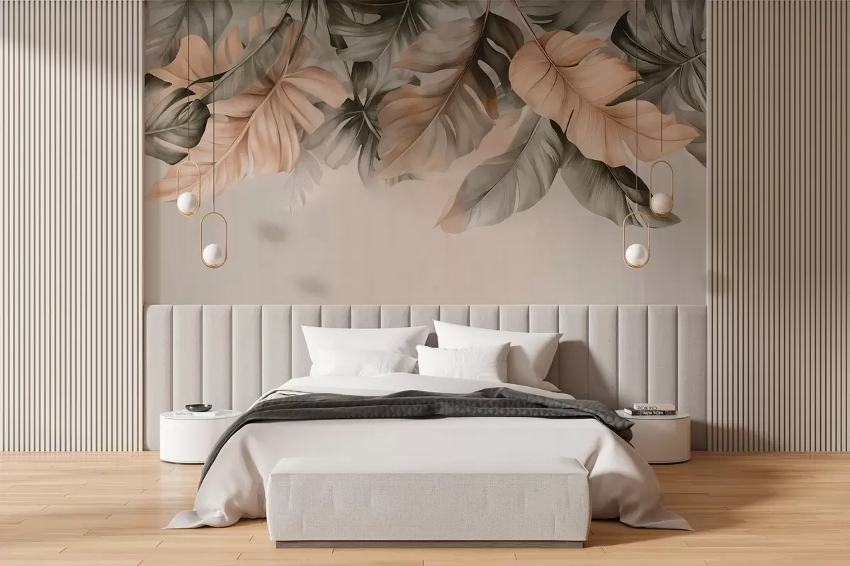 Fotomurales Hojas tropicales colgando de la parte superior, sobre un fondo texturizado Nr. w03290