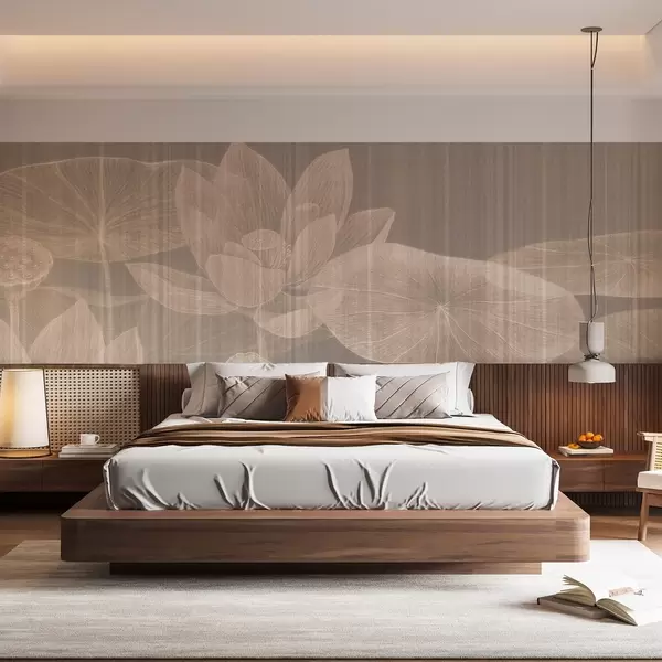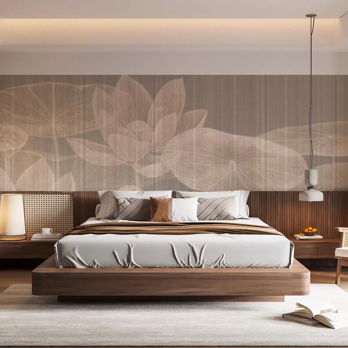 Fotomurales Elegante ilustración de lotos y nenúfares en tonos pastel con efecto de lino texturizado, Nr. w03324v1