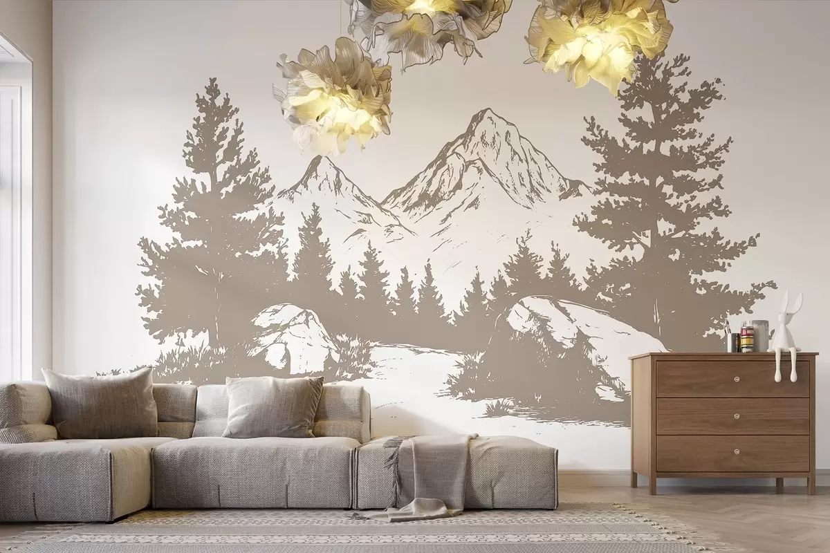 Fotomurales Los Alpes, montañas con bosque, dibujo lineal, color beige Nr. w03342