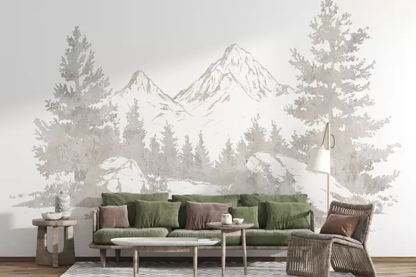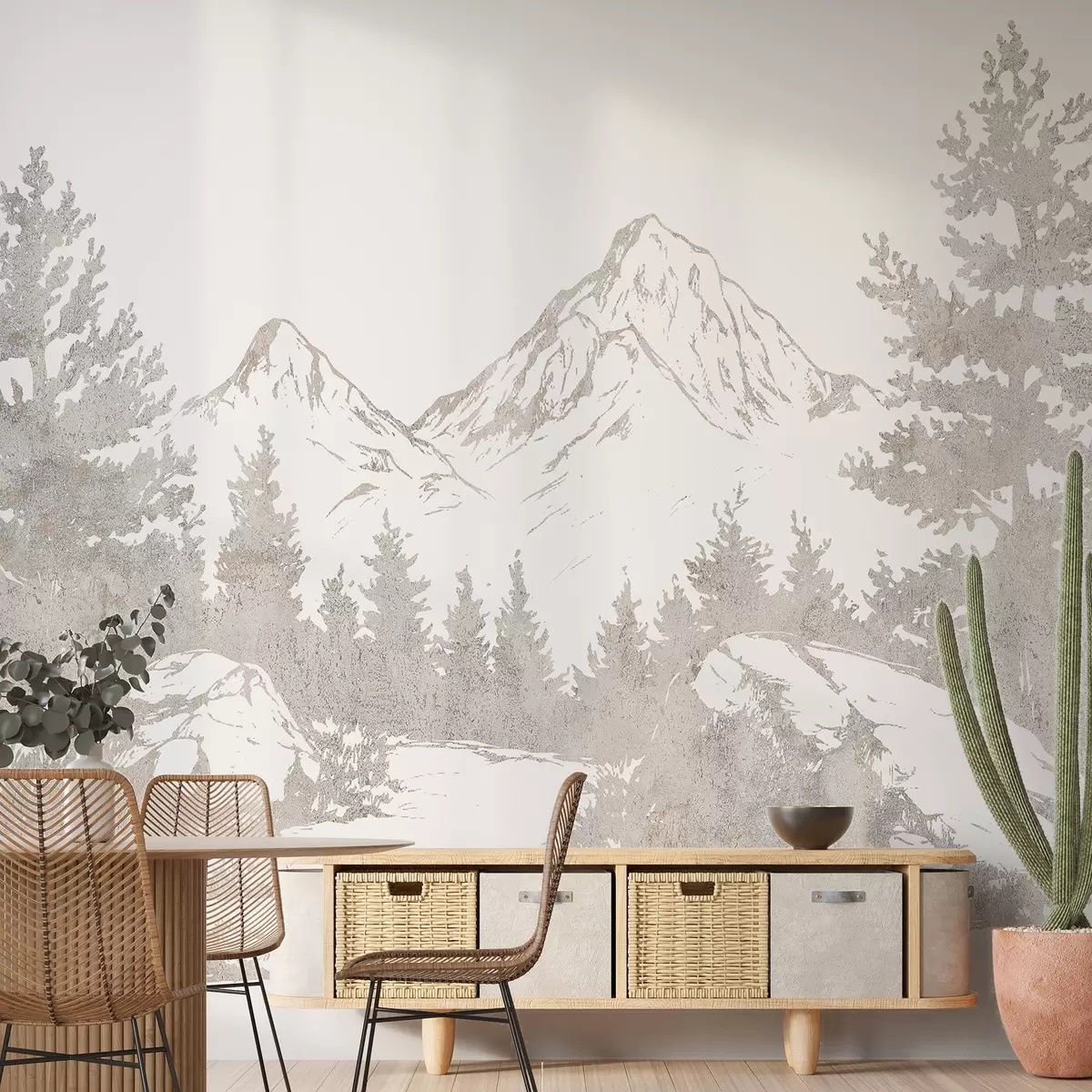 Fotomurales Los Alpes, montañas con bosque, dibujo lineal, colores naturales Nr. w03343